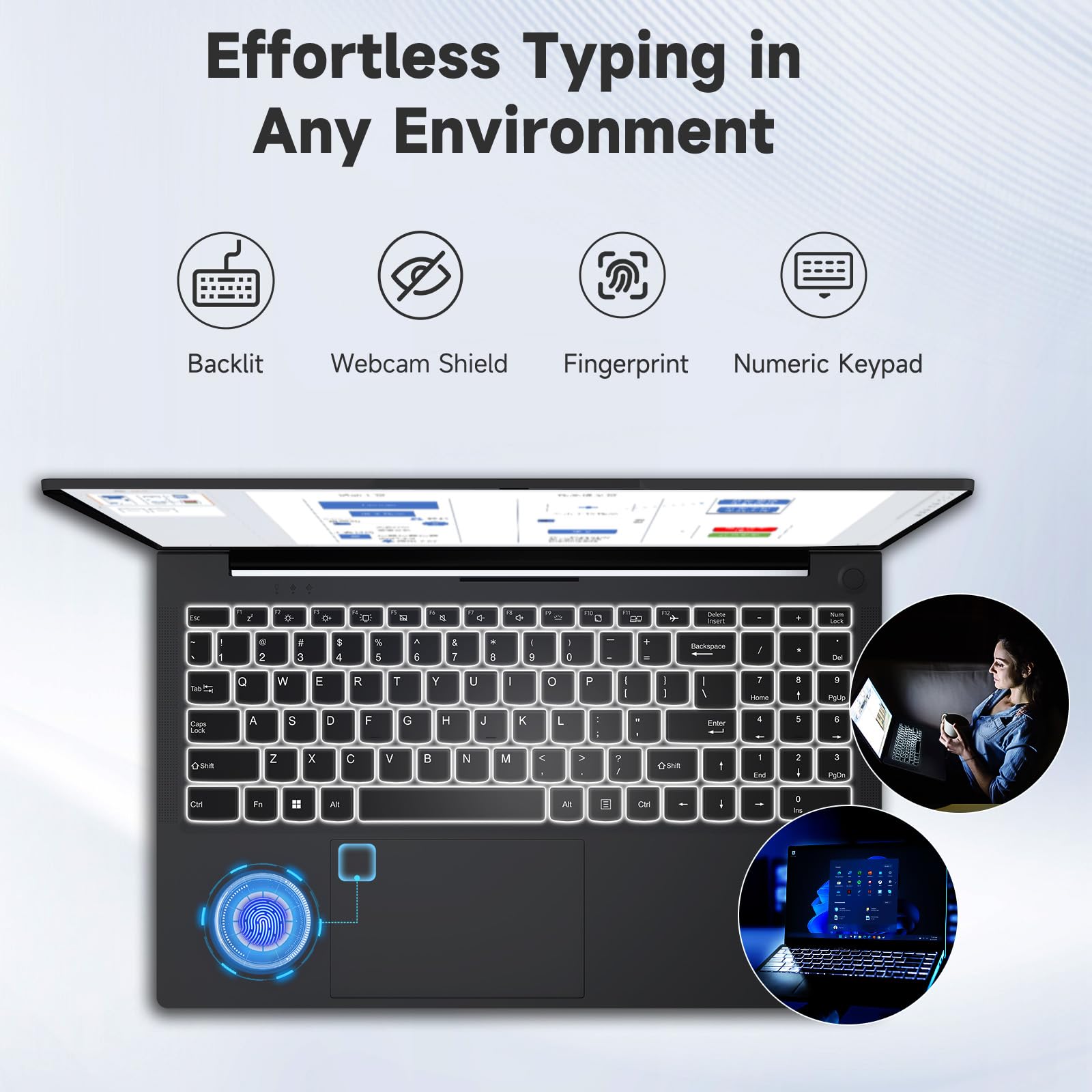 - Humanized Design: The NIMO Laptop features an original factory screen with a 15.6" FHD IPS (1920x1080) anti-glare display, offering an 85% screen-to-body ratio, 16:9 aspect ratio, and a micro-edge design. The built-in fingerprint reader on the touchpad allows secure, one-touch login, eliminating the need for a password every time. A backlit keyboard ensures easy typing in low-light environments, and the touchpad supports scroll and multitouch capabilities.