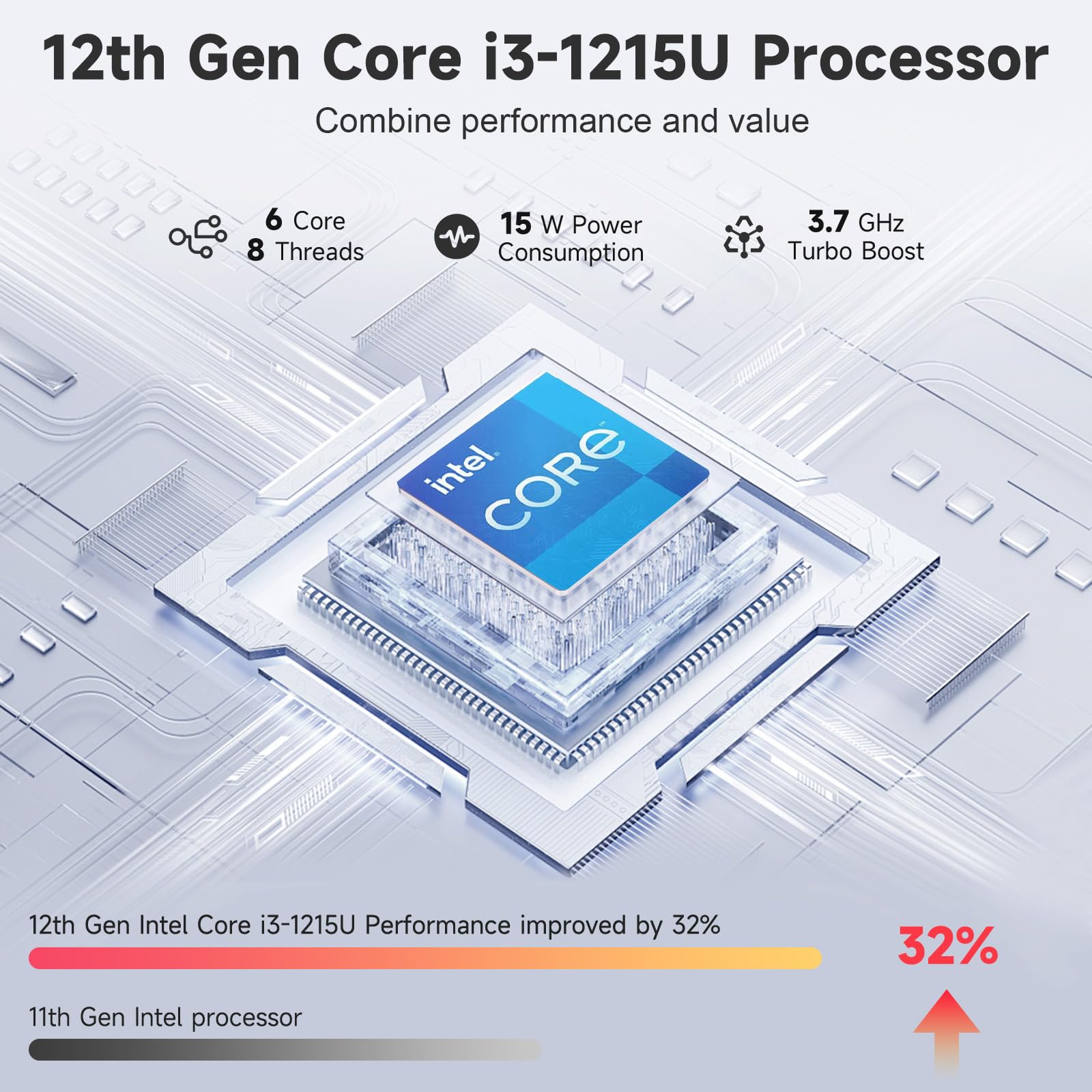 - Efficient Power & Cooling Balance: The Intel Core i3-1215U processor is designed with 2 performance cores and 4 efficiency cores, offering a low base power draw (~6W) while delivering bursts up to 4.4GHz when needed, ensuring an efficient power and cooling balance.
